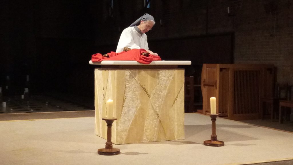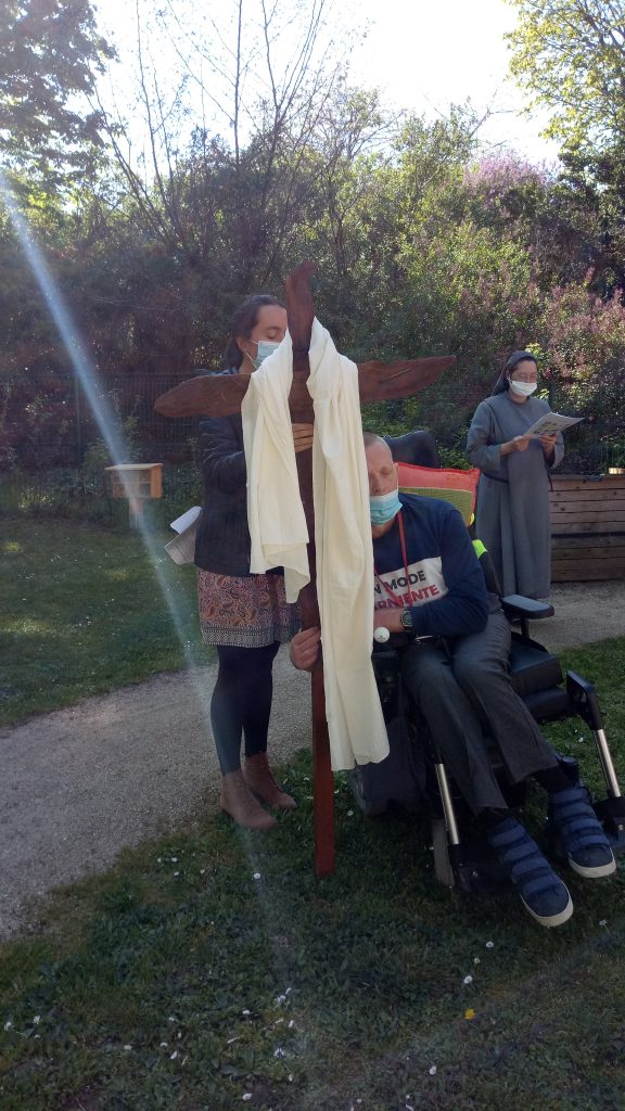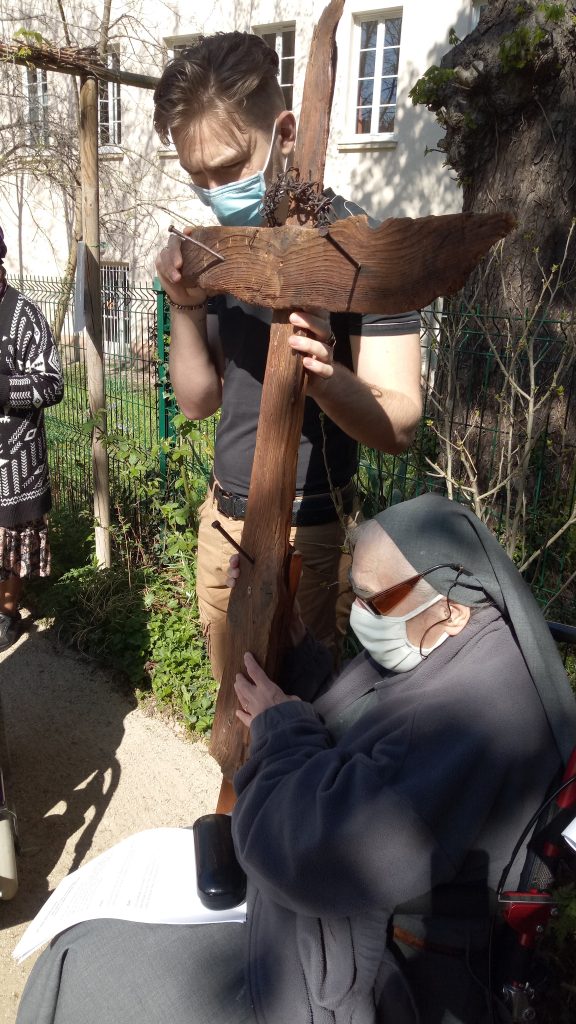 Tous et toutes consolent le Fils de Dieu sur son chemin de passion traversé par l’humanité d’hier et d’aujourd’hui.. Le Christ a saisi leurs mains et nous extirpe avec eux du creux de l’enfer. Au carrefour du salut, sur le Golgotha, les trois croix sont toujours plantées, l’une porte la marque de l’espérance. La croix redevient un arbre de vie sur lequel s’est endormi le Maître et le Seigneur … un arbre qui retrouve ses fleurs et pour l’heure nous invite à la patience, à la contemplation.