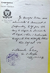 29 juin 1916, confirmation au séminaire de la congrégation des Pères du Saint Esprit, rue Lomé.