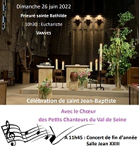 Messe de saint Jean-Baptiste au prieuré à 10h30, suivi du concert de fin d’année, à la salle Jean XXIII et d’un buffet amical, possibilité de visiter l’exposition du centenaire de la congrégation !