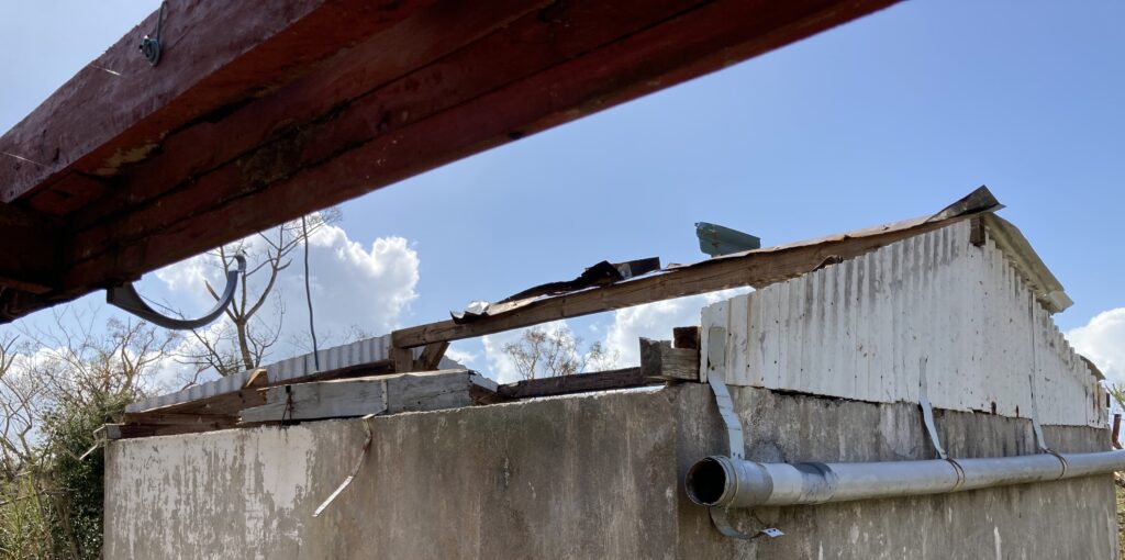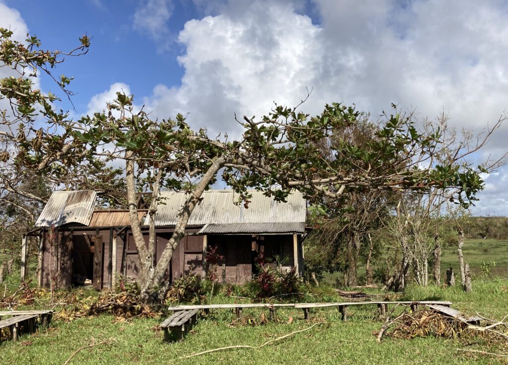 L’ancienne maison : tout le toit est parti et toutes les fenêtres sont abimées.