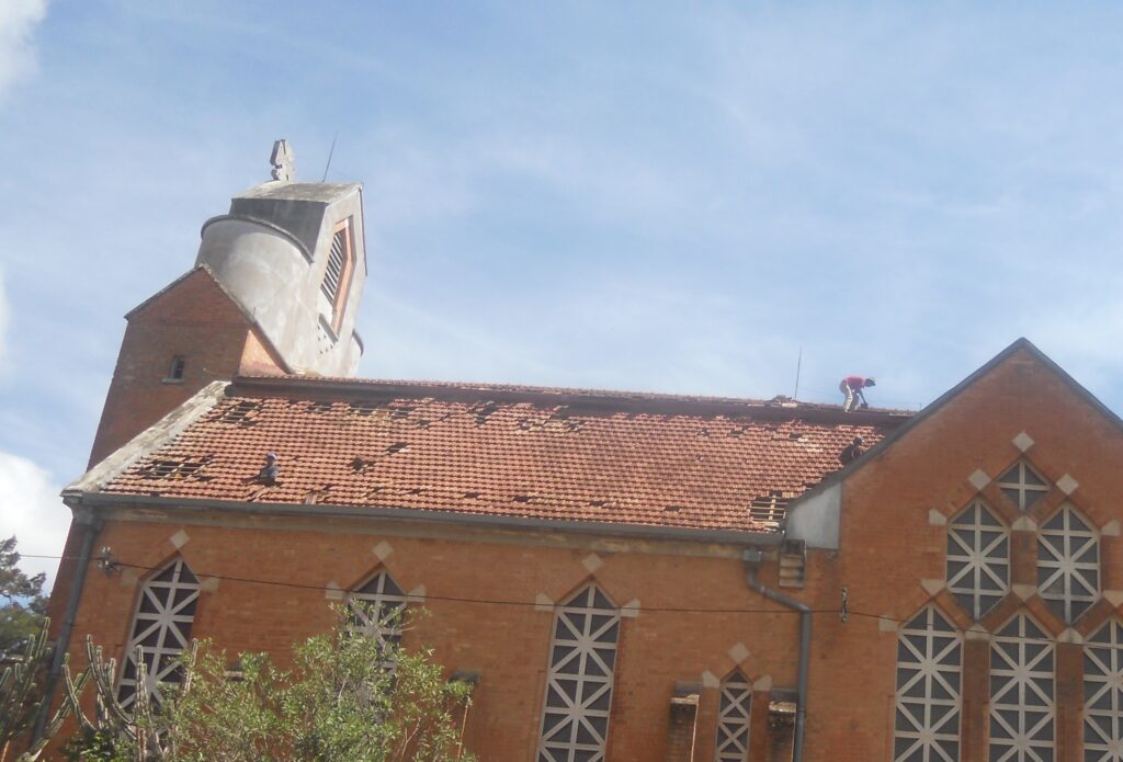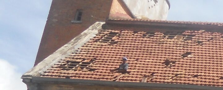 Plusieurs parties de toit de l’église sont tombées par terre, par le vent, surtout le bord du toit. Et une petite partie du toit de la roberie aussi.
