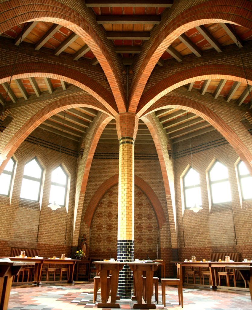 Moderne, Dom Bellot utilise les moyens techniques de son temps (brique, béton, charpentes métalliques) au service d’une conception qui puise sa force dans l’étude et la méditation des traditions architecturales monastiques.