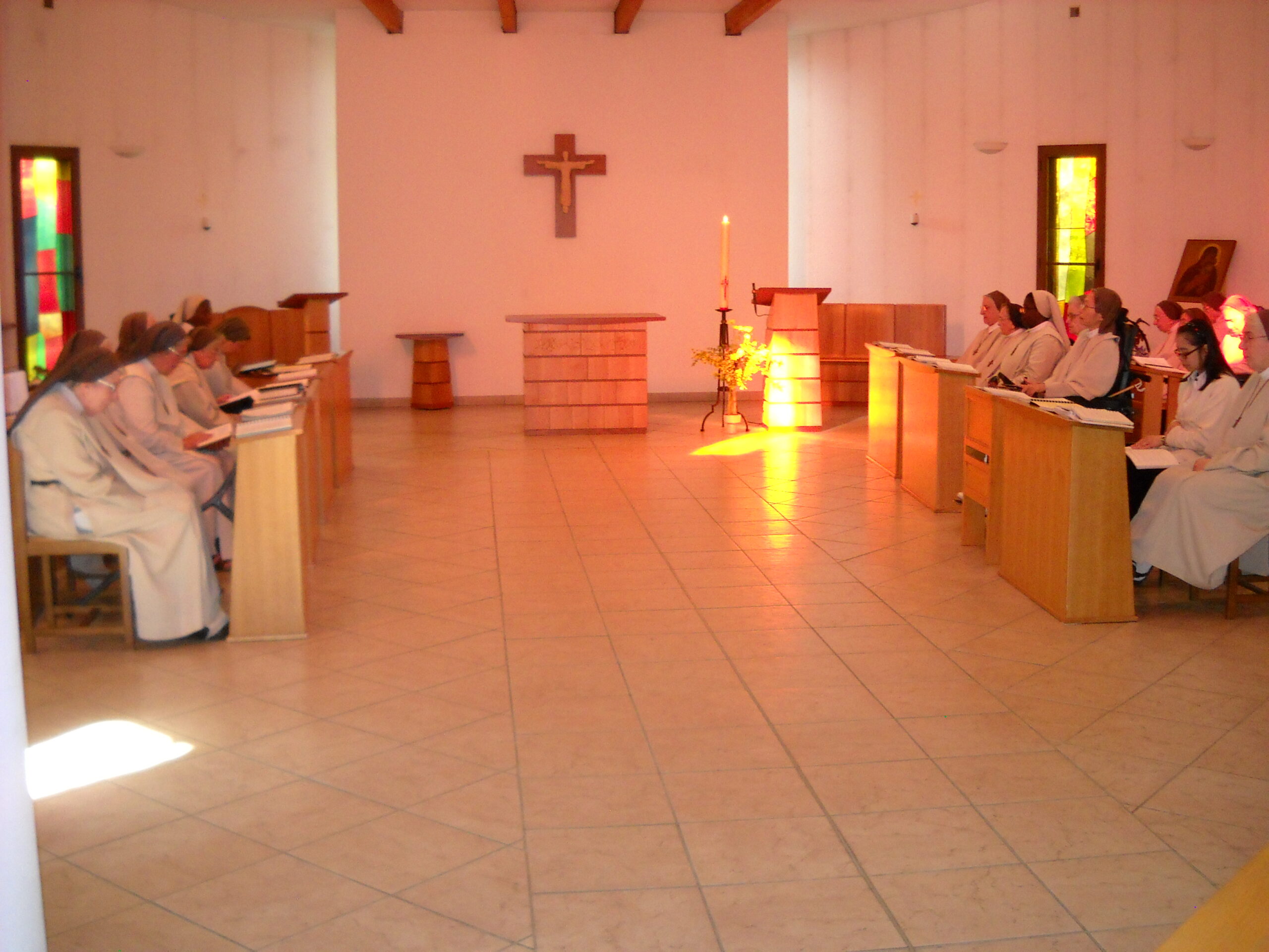 A 17h 45 ce sont les vêpres. Un office durant lequel on célèbre le Christ Soleil toujours rayonnant à l’heure où le jour baisse… On rend grâce aussi pour la journée écoulée. Si je comprends bien, vous êtes toujours seules ou ensemble ? Oui, comme le reste de l’humanité !…