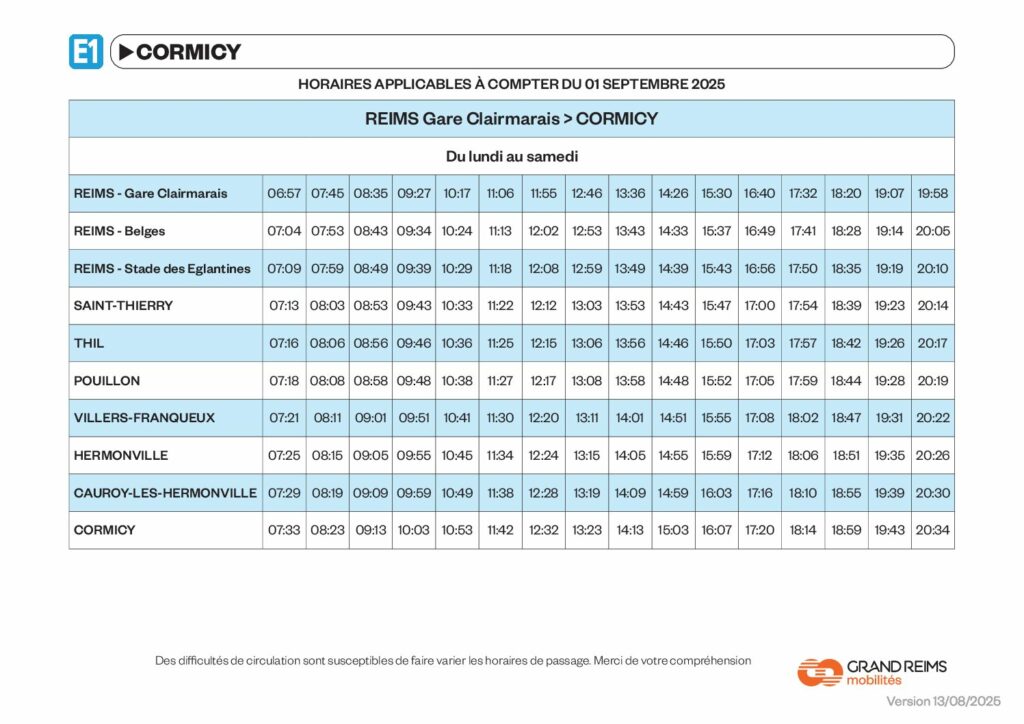 Pour trouver le départ de la Ligne E 1 à la gare de Reims: Reims-Clairmarais (horaire au-dessous)